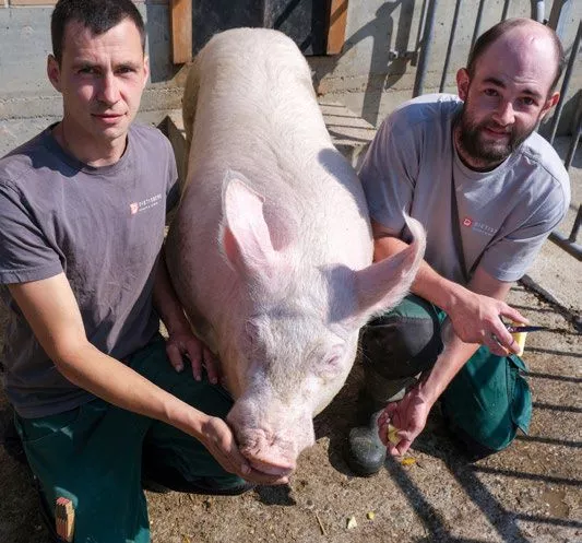 Pascal Vogt (Leiter Schweine) und Severin Balsiger (Bewohner Dietisberg) kümmern sich um den neuen Eber.